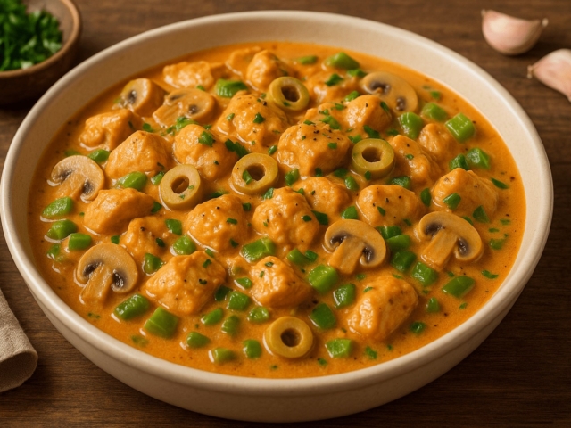 5. Sirve el pollo strogonoff cuando la salsa se haya espesado y decora con perejil fresco picado.
